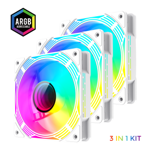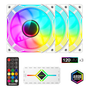GameMax KF300 WH, 120mm White frame ARGB Fan 3 in 1 Kit, Along Includes Premium V4.0 ARGB HUB with Wireless Remote Controller - High-Performance Cooling Fan for PC Case •【Intelligent Speed Control】3 pcs 120mm full function ARGB PWM fans •The intelligent temperature controls the speed at 800~1600±10% RPM, by linking to the motherboard PWM 4pin socket, so the fan speed auto controlled and keeps the fans quiet •These fans are 3pin 5v ARGB connectors that connect with ARGB control HUB one by one •【Inner And Outer Light】Addressable RGB LEDs can be controlled by ARGB remote controller(Included package), Multiple ARGB light modes and speeds, provide colorful streamer lighting effects •creating a practical and beautiful cooling system •You also can turn on / off the fan light effect and switch the fan hub ARGB signal to the motherboard 5V ARGB port by AURA Sync Mode •【Shockproof Design】The fan frame is fixed on both sides with 8 pieces of shock-absorbing rubber pads •The rubber soft material which is not easy to peel off has a good shock-absorbing effect, which can make the internal operation of the computer case stable and reduce the noise output between the fan and the computer case •The maximum noise of the fan is only 31dBA •【V4.0 ARGB HUB-PWM | 5V ARGB Sync】Remote Control multi-featured hub, Magnetic design for easy installation, the magnet at the bottom of the controller can be firmly attached to the metal plate of the chassis, making installation easy!