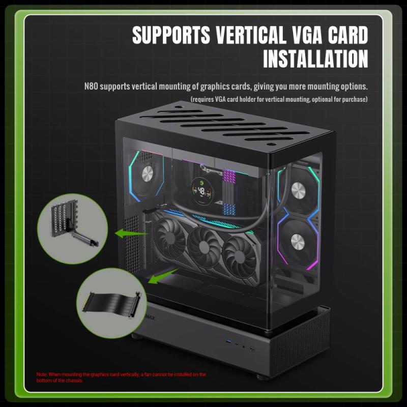 • Vertical GPU Mount: Show off your graphics card with enhanced cooling and style.
