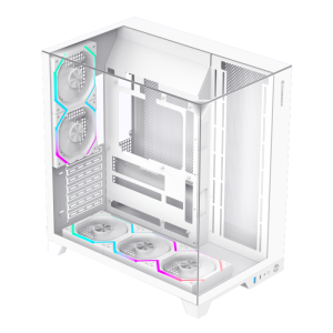 Infinity Pro White Panoramic Tempered Glass Mid-Tower Gaming PC Case •Full-View DesignThe three sides feature tempered glass panels, allowing clear visibility of the RGB lighting and components inside the case, enhancing the overall aesthetics and creating a cool gaming environment. •Superior Cooling PerformanceThe case supports up to 8 RGB fan installation positions (including 2x 120mm fans) and can accommodate various water cooling configurations, ensuring the system maintains optimal temperatures under high load, thus enhancing gaming performance. •Strong CompatibilitySupports ATX, M-ATX, and ITX motherboards, making it suitable for various types of hardware, allowing players to flexibly configure their gaming setups to meet different needs. •Smart I/O Interface DesignEquipped with multiple USB ports (including USB 3.0 and TYPE-C) for convenient device connections, along with audio support to ensure users enjoy the best sound experience during gaming. •Excellent ExpandabilityThe case offers multiple internal storage bays, including 1x 3.5-inch hard drive bay and 3x 2.5-inch SSD bays, making it easy for players to expand their storage space to meet the growing demands of gaming.