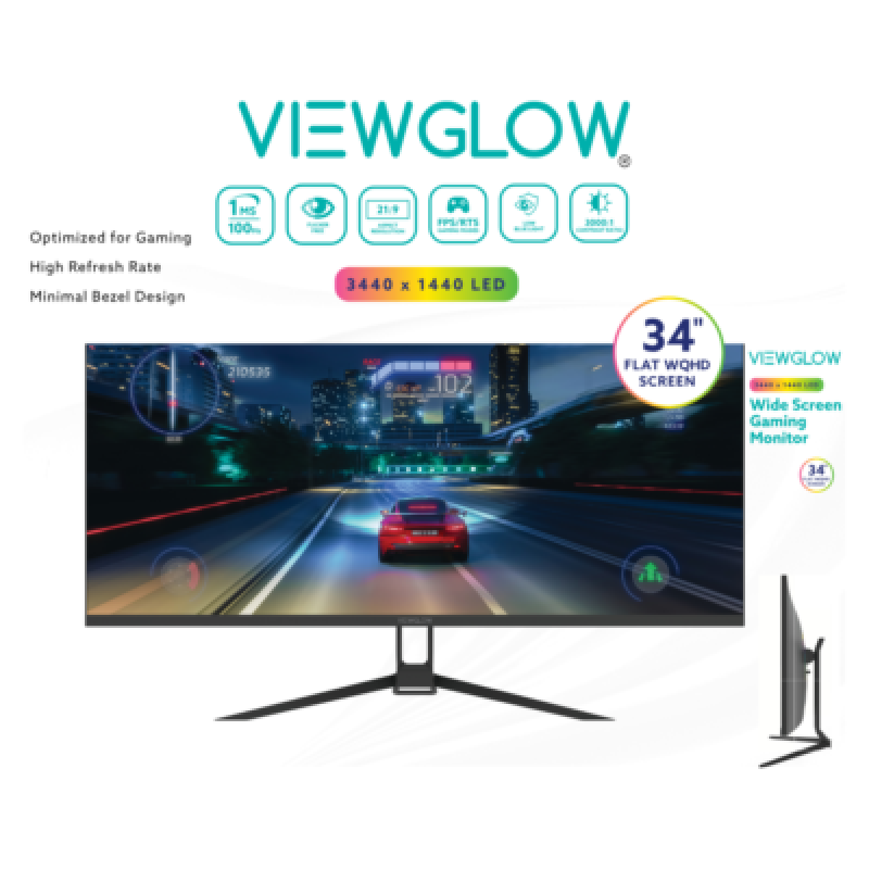 ViewGlow 34" GAMING MONITOR 3440X1440 LED WQHD 1MS 100HZ 21:9 WIDE MONITOR IMMERSIVE GAMING